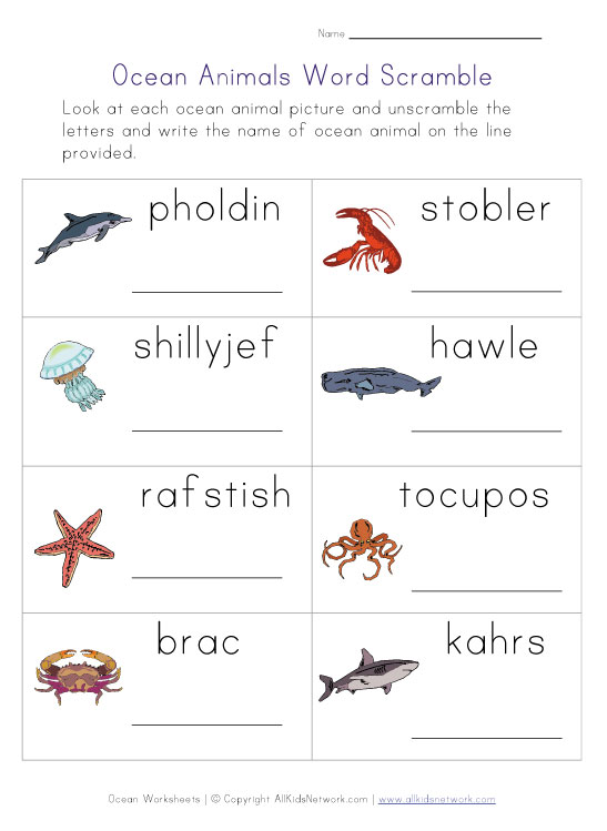 animals worksheets ocean kids word animal scramble printable worksheet words science activities sea kindergarten preschool activity allkidsnetwork scrambles school printables